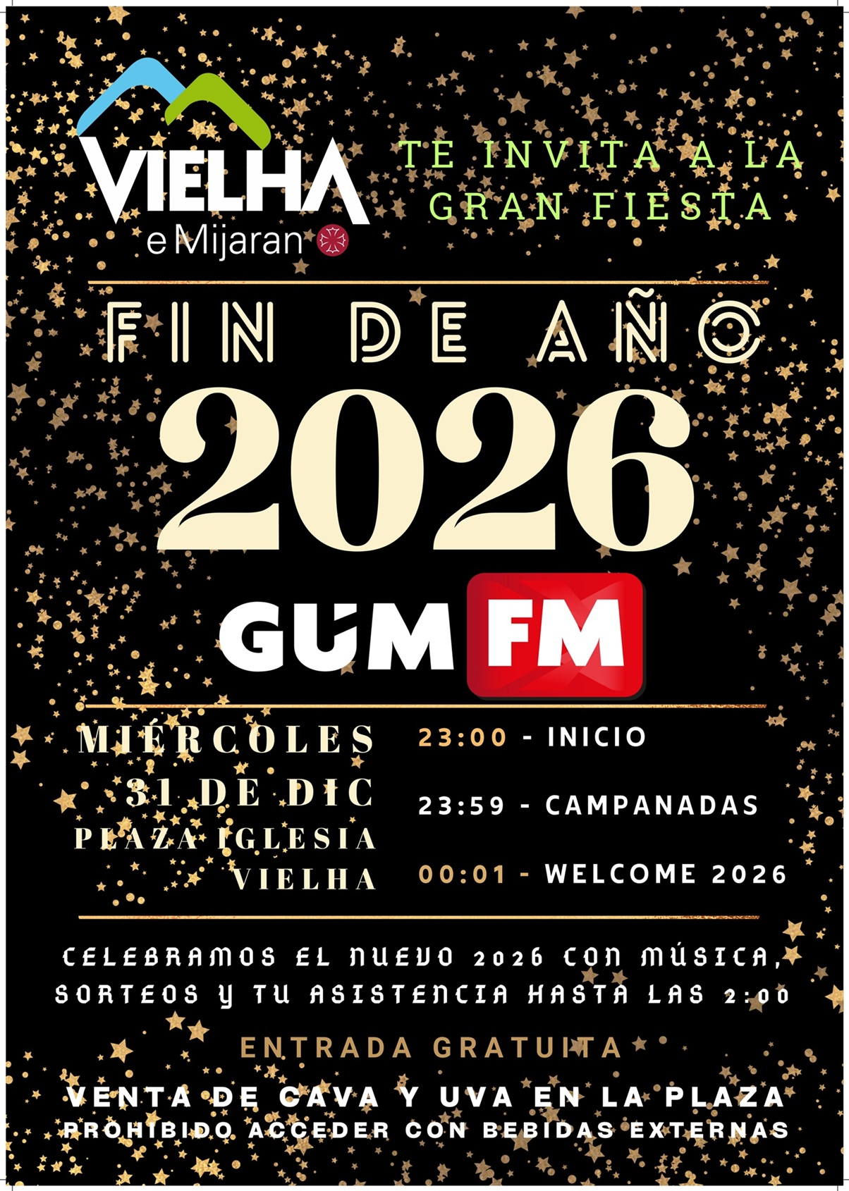 desembre, 2025 31des01genFIESTA DE FIN DE AÑO 2025 - VIELHA HorariDesembre 31 (Dimecres) 00:00 - Gener 1 (Dijous) 08:00 CalendariGoogleCal