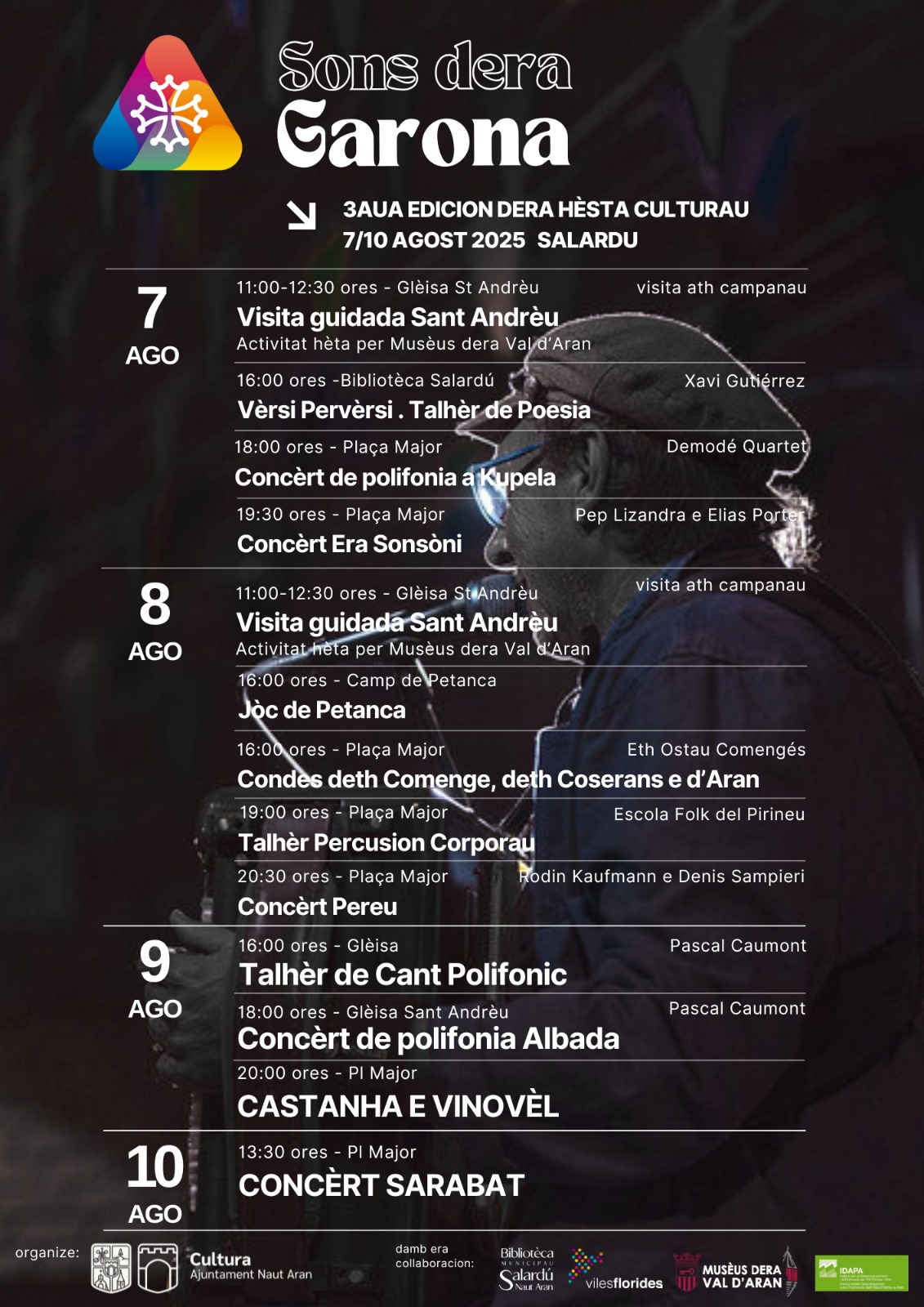agosto, 2025 07ago(ago 7)00:0010(ago 10)00:00SONS DERA GARONA 2025 - SALARDÚ Horario7 (Jueves) 00:00 - 10 (Domingo) 00:00 CalendarioGoogleCal